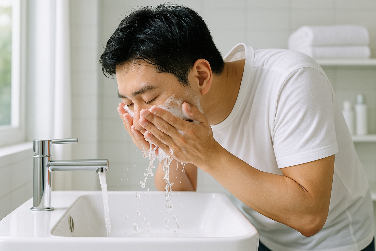 미지근한 물에 세안제를 충분히 거품낸 후 T존부터 부드럽게 마사지하며 30초간 세안합니다. 뜨거운 물은 피부를 건조하게 만들고, 찬물은 모공 청소에 효과가 떨어집니다.